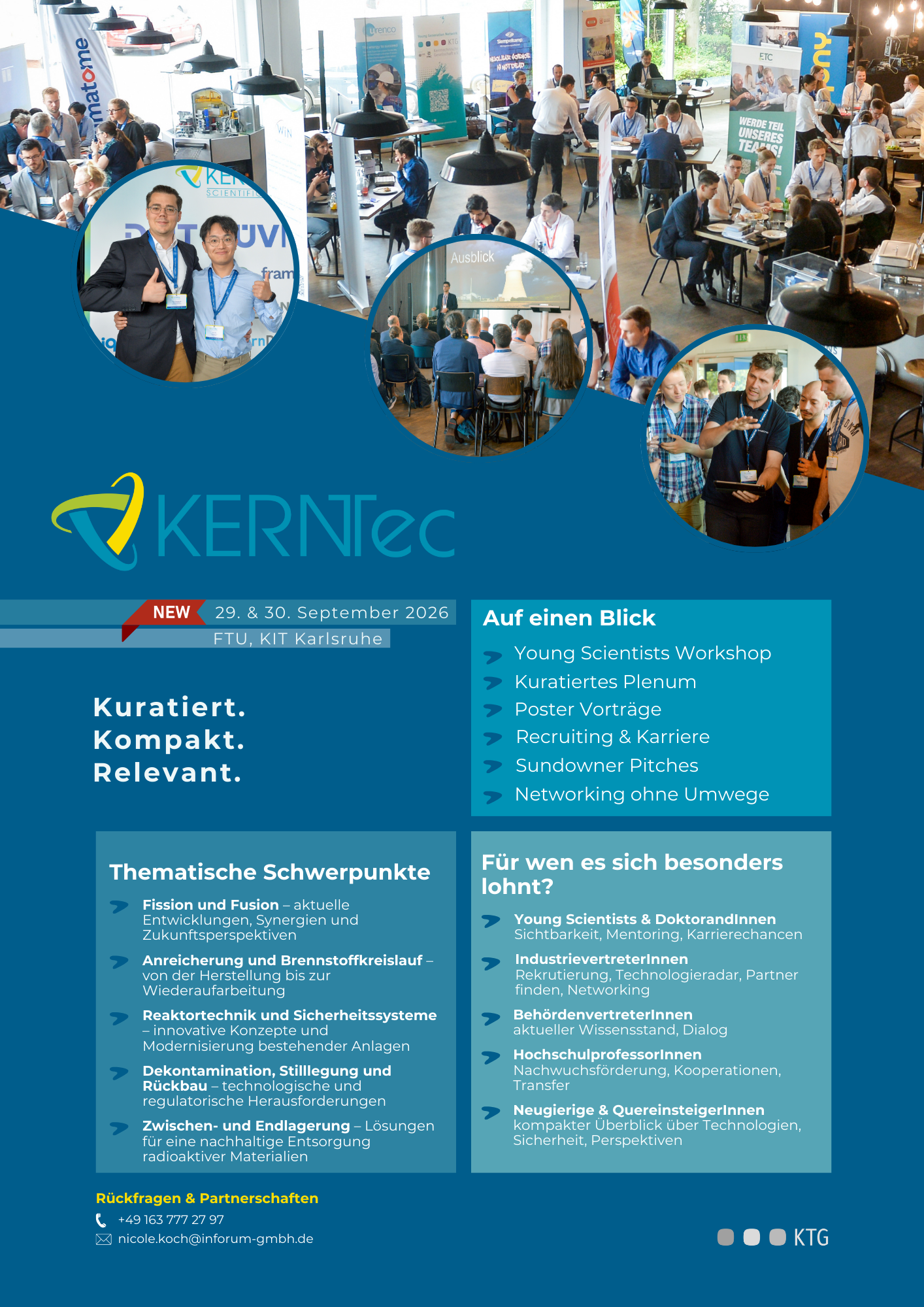Die KERNTec bringt Menschen zusammen, die Kerntechnik praxisnah weiterdenken: kompakt, fokussiert und mit viel Raum für Austausch – von Forschung bis Industrie, von Karriere bis Technologie.